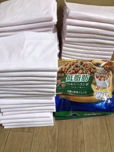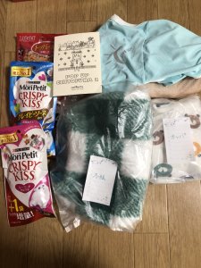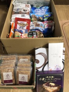 ペットフード、シート、体拭き、おやつ等、たくさん頂きました。