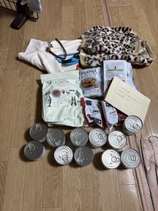 犬用フード、オムツ、ブランケット、マット、お散歩バックを頂きました。