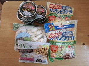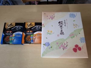 メッセージと共に犬用フード、おやつ、猫フード、トイレシート、Amazonギフト、お菓子を頂きました。