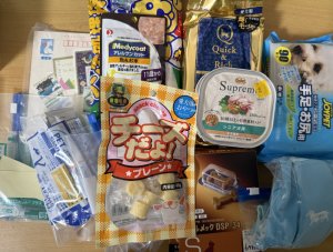 犬用フード、シャンプータオル、予防薬などをいただきました。