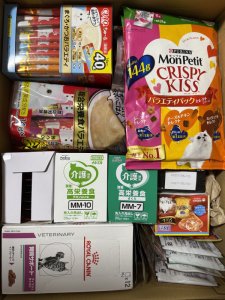 犬用フード、猫砂、洋服、シャンプータオル等を頂きました。