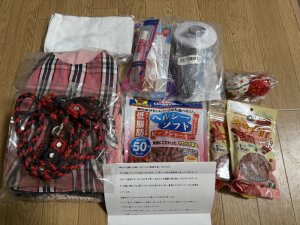 お手紙とともに、犬用フード、洋服、リード、デンタルケア用品等を頂きました。