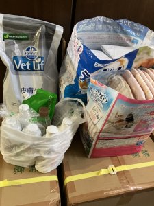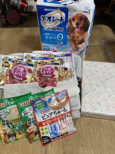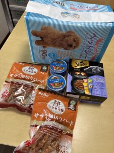 トイレシート、犬のオヤツ、キャットフード、ドックフードを頂きました。