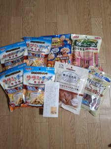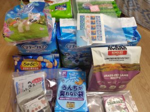 ペットシート、マナーウェア、犬用フード、うんち袋、予防薬、切手、テレカなどを頂きました。