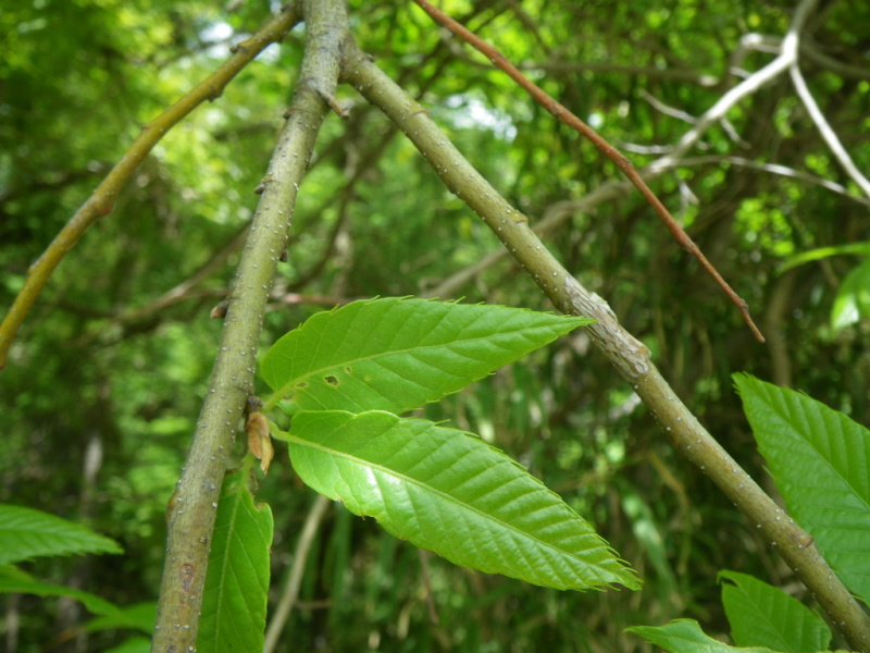 葉が右右左左と付くコクサギ型葉序で、三行脈が目立ち、樹皮は短冊状に縦に裂けています。