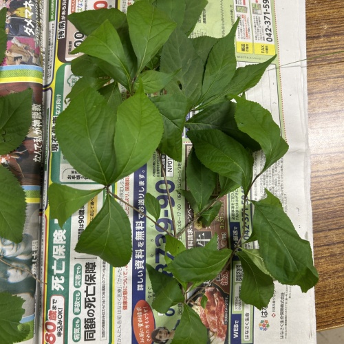 両者を比較しても、左の方が葉先の伸び出しが少なめで鋸歯が角張り気味な点を除けば、ムラサキシキブの特徴に合致するように思います。