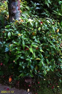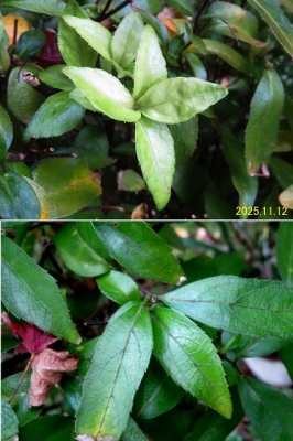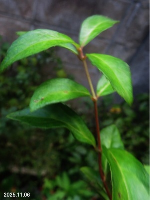 以下の写真は今の11月の写真です。葉は対生のようで、軽い鋸歯があります。5月のものには強い鋸歯がありました。