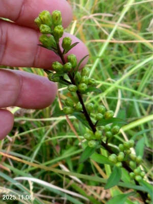 つぼみらしいものは、5mmくらいの俵状です。葉は、互生しているようで、長楕円形の葉で鋸歯はなさそうです。茎は黒っぽくて硬いものです。