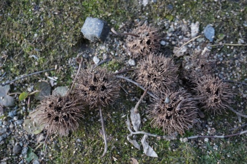 裂開した果実、花弁のない花の残り、枝痕、