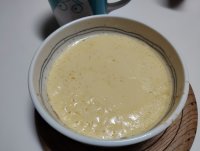 野菜汁た卵の茶碗蒸し風卵汁にフレーク少々入れました卵1個500w2分30秒以前に比べ上手になってきました