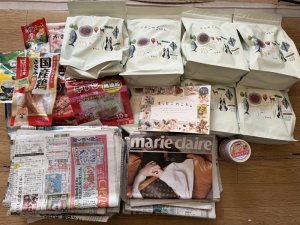 メッセージと共に犬用フード、おやつ、猫フード、トイレシート、Amazonギフト、お菓子を頂きました。