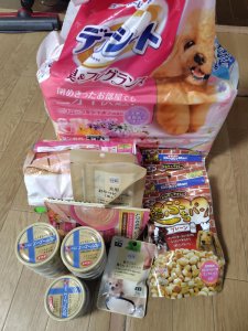 犬用フード、オヤツ、トイレシートなどをいただきました。