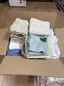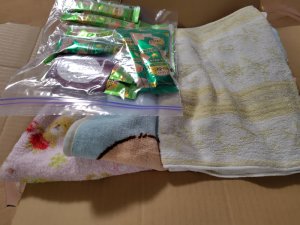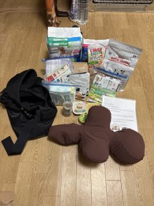 お手紙と共にワンちゃん用療養クッション、オムツ、キャリーバック、ちゅーる、ドックフードを頂きました。