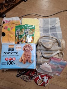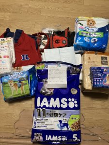 お手紙、犬用ご飯、ペットシート、マナーウェア、ネクスガード、ハーネスをいただきました。
