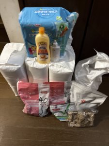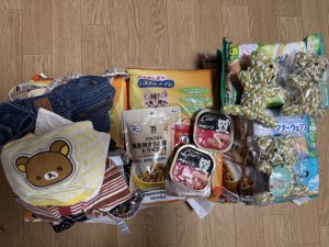 トイレシート、おむつ、シャンプー、ドックフード等を頂きました。