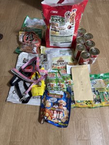 お手数と共に犬用フード、おやつ、ハーネス、お洋服、お菓子を頂きました。