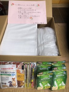 お手紙と共にペットシート、歯磨きシート、フード、おやつを頂きました。
