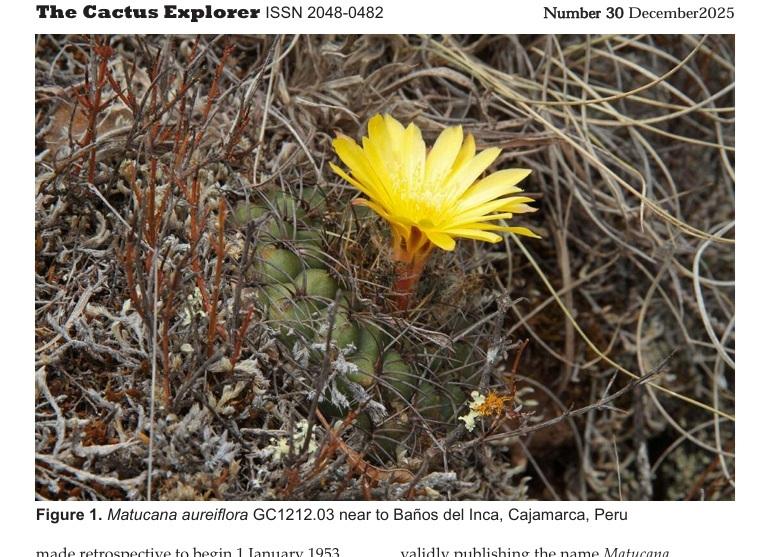 私たちの一人(アロミア・コラゾス)がペルーのサボテンの学名について綿密かつ詳細な調査を行った結果、Matucana属に関連するいくつかの学名が、藻類・菌類・植物の国際命名法(マドリード規約)の現行版(Turland et al. 2025)において命名上の問題を抱えていることが判明しました。この規約の各新版は、それ以前のすべての版に取って代わります(前文14、Turland et al. 2025: 2)。また、規約の変更は、特に明記されていない限り、遡及適用されます(原則VI、Turland et al. 2025: 3)。
