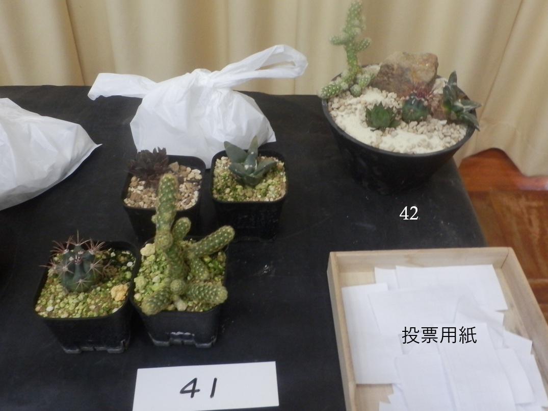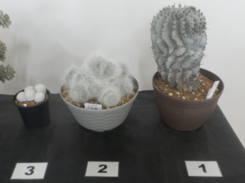 今月のミニ展の紹介ですが、お題は「白く見えるサボテン・多肉植物」で出展は33作品、恒例の順位当てクイズの正解者は4名いました。