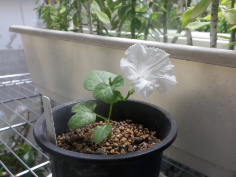 昨年の12/28に玄関先の変化朝顔のスプリットペタルと、アコーデオン沿いの変化朝顔(青花・白花)を整理して、種取りもしましたが、こぼれ種から1本双葉が出た苗を見つけたので、ダメもとで鉢植えにして家の中のサボテンの実生接ぎの棚に取り込んでいましたが、蕾が2つついていました。どんな花が咲くか楽しみにしていましたが白花でした。