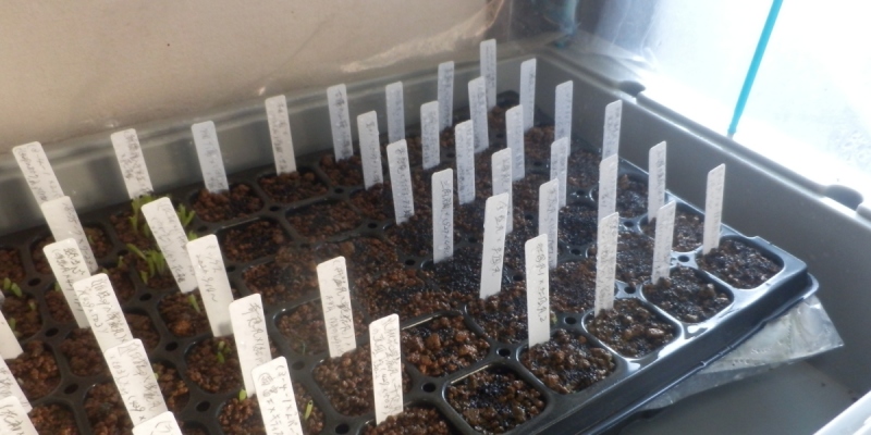玄関の保育器に取り込んだ種まき床(72穴連結トレー)の空きスペースに冷蔵庫で放置されていた古い種(2019年種取りの袖ヶ浦を中央の10穴と2020・2021年種取り24種をその右側)を捨てずに、空いていた右側に試験的に播いてみました。